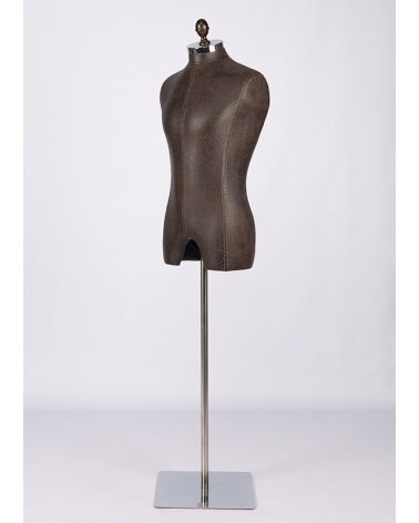 Busto de hombre de maniquí tapizado en polipiel con top de bellota ideal para exponer ropa de hombre o como decoración de la tienda. Maniquí de medio cuerpo ideal para tiendas de ropa elegante.