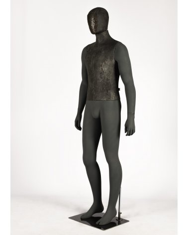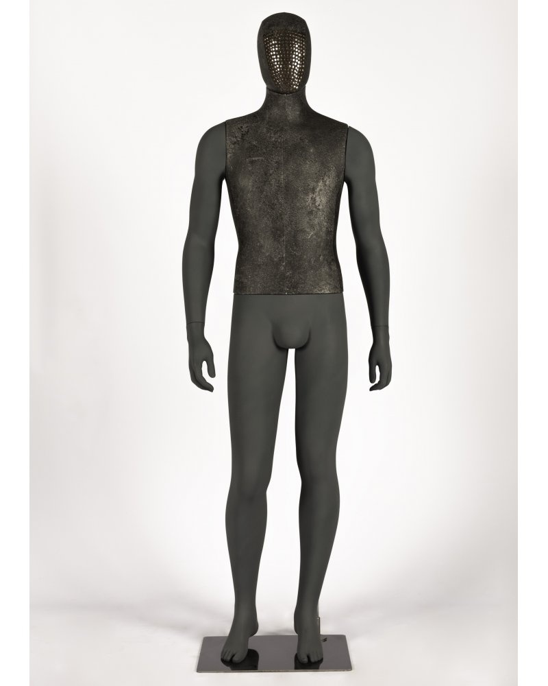 Maniquí de hombre en posición relajada. Cabeza oval tapizada en ecopiel efecto metálico con tachuelas y torso tapizado en la misma ecopiel color gris, piernas y brazos pintados en gris oscuro.