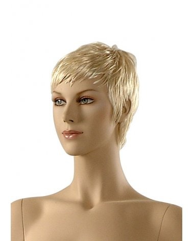 Maniquí de mujer de estilo realista con maquillaje y peluca de estilo pixie. Postura de brazos cruzados delante. Acabado disponible: color piel.