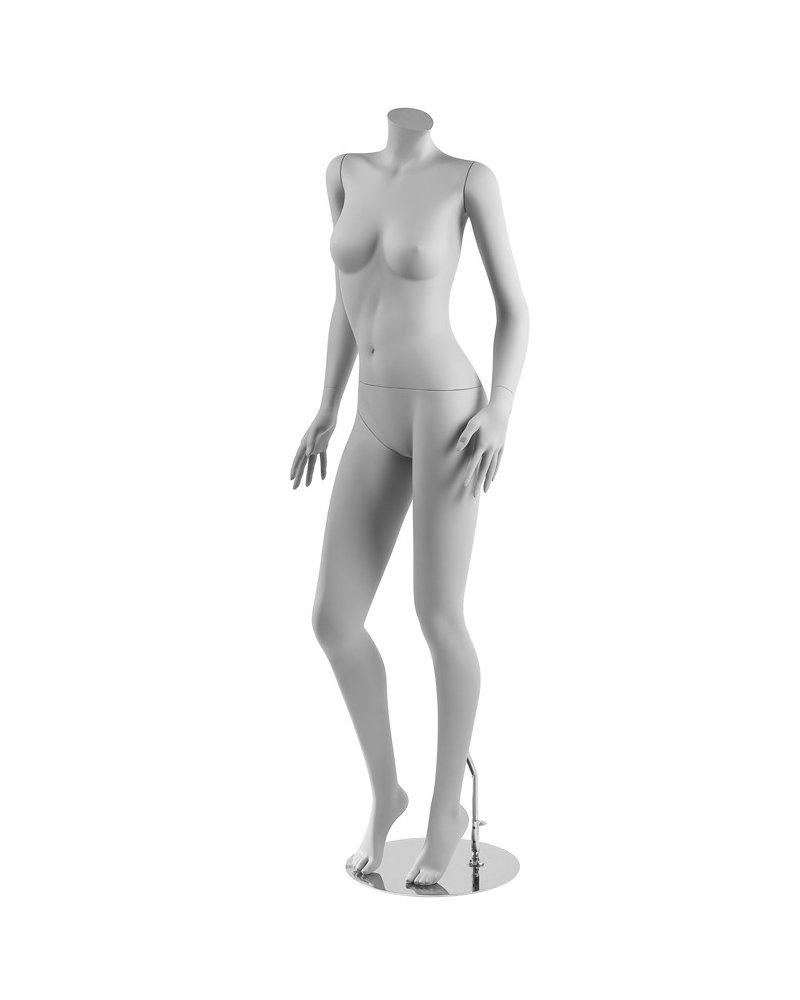 Maniquí de mujer colección Desiree, sin cabeza. Sus formas y posturas le aportan una imagen dinámica y sofisticada. Maniquí fabricado en poliéster y fibra de vidrio. Incluye una base redonda cromada con fijaciones en el pie y la pierna que posibilita ponerle zapatos.