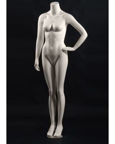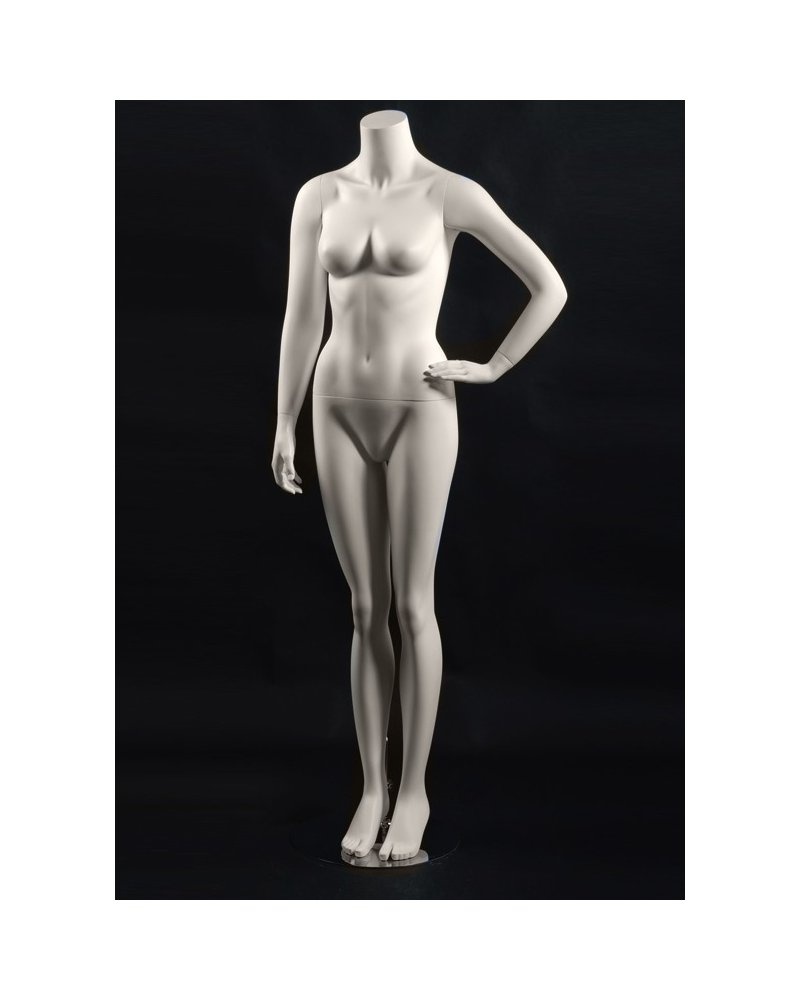 Maniquí de mujer sin cabeza. Posición de piernas rectas y brazo apoyado en la cadera. Acabado disponible: color blanco roto.