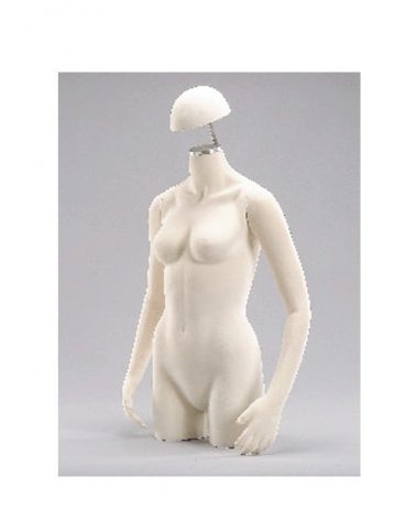 Torso de mujer de sobremesa con brazos flexibles y remate en top metálico. El cuerpo está fabricado en poliéster y fibra de vidrio y los brazos en espuma de poliuretano, lo que permite darle multitud de posiciones. El torso y los brazos están tapizados en tela de algodón color beige. Además, incluye complemento para exponer sombreros que puede poner y quitar. El torso está diseñado para su uso en estantes y/o sobre mesa por lo que no se puede utilizar con soporte.