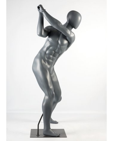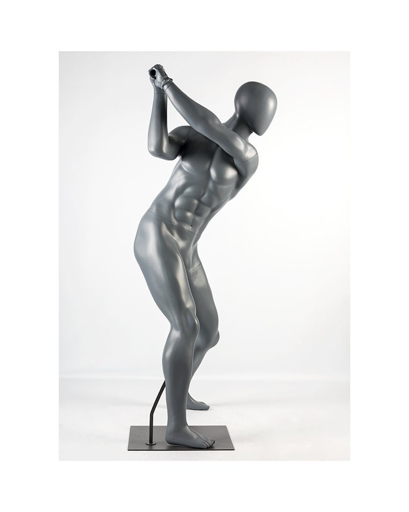 Maniquí de deporte hombre, practicando golf de estilo casual y con cabeza oval. La colección de maniquíes deportivos recopila una gran variedad de maniquies en actitud deportiva.