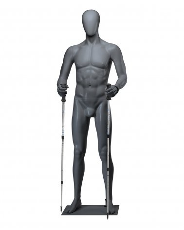 Maniquí de hombre con brazos sujetando dos bastones de trekking y piernas separadas en posición recta.Silueta de músculos definidos para realzar la ropa deportiva.