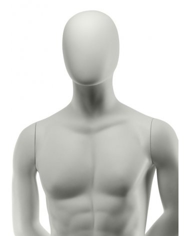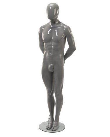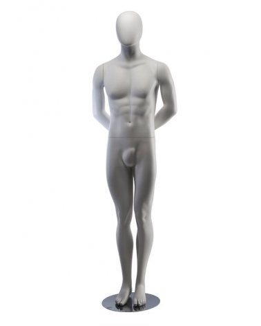 Maniquí de hombre con cabeza oval sin rasgos y brazos cruzados detrás. Acabado disponible:gris satinado.