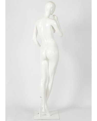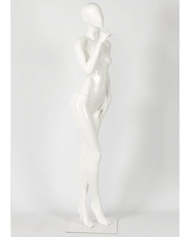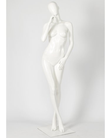Maniqui de mujer en posición relajada y pensativa de estilo cabeza huevo. La colección de maniquíes Casual de estilo moderno y elegante reúne diseños de maniquíes de ambos sexos.