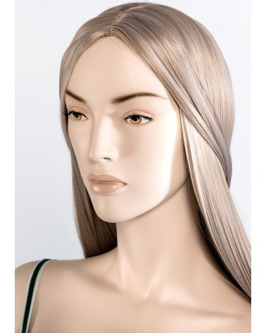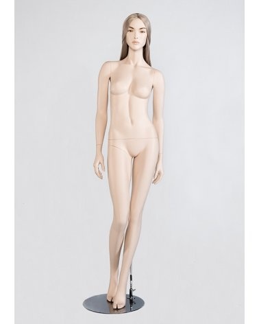 Maniquí Fabricado en Poliéster + Fibra de vidrio, suministrado en color piel y maquillaje, incluye peluca y base redonda de metal. Si necesita cualquier customización, como el estilo de base o de peluca, puedes consultar las posibilidades en nuestro servicio de atención al cliente.