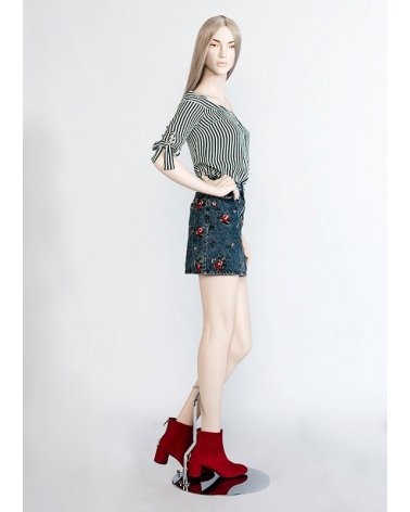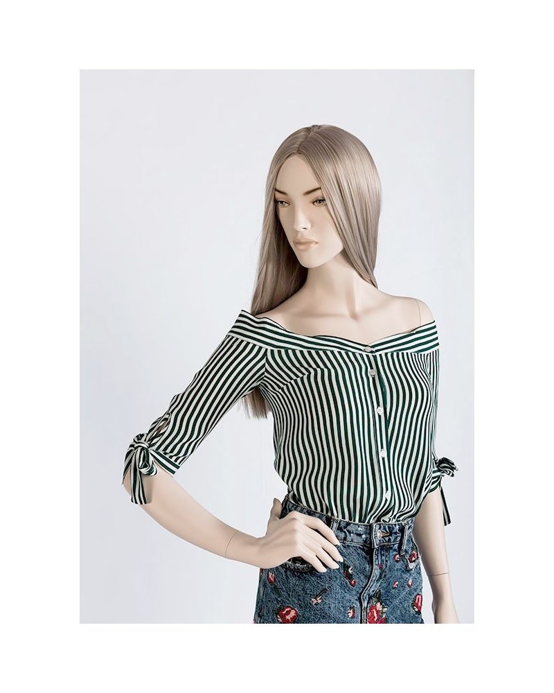 Maniquí Fabricado en Poliéster + Fibra de vidrio, suministrado en color piel y maquillaje, incluye peluca y base redonda de metal. Si necesita cualquier customización, como el estilo de base o de peluca, puedes consultar las posibilidades en nuestro servicio de atención al cliente.