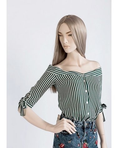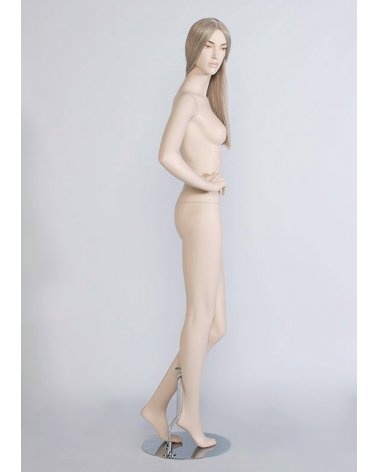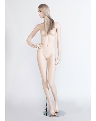 Maniqui de mujer de estilo realista posando con mano a la cintura. La colección de maniquíes Soft chic reúne diseños de maniquíes femeninos de espiritu joven y rasgos suaves.