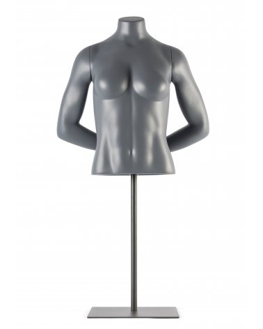 Torso de mujer ideal para exponer ropa y complementos de estilo deportivo o casual. Maniquí fabricado en poliéster y fibra de vidrio, suministrado en color gris, incluye base cuadrada.