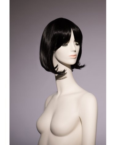 Peluca de pelo sintético para maniquí. Media melena con flequillo en color negro. Fácil de peinar.