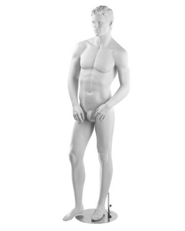 Man mannequin in realistic style with sculpted hair, posing with arms placed in front. Matt white finish and skin color.