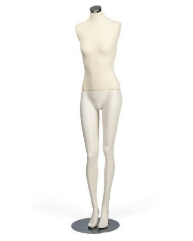 Woman headless mannequin and without arms. Torso upholstered in beige cotton fabric and legs painted in beige. Basic leg posture.