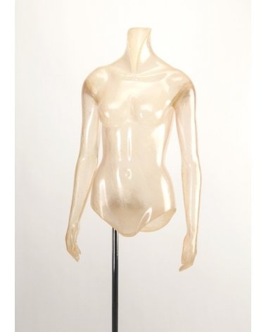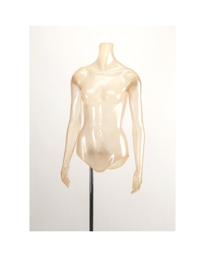 Mannequin torso for women finished translucent in green color, perfect to expose dresses, swimwear or lingerie. Torso made of polyester and fiberglass and metal base included.